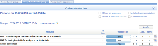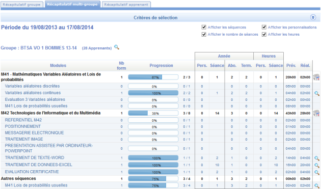 Vous pouvez également en cochant les différentes cases faire afficher un niveau de détail plus élevé, nombre d'heures, nombre de séances, les séquences...