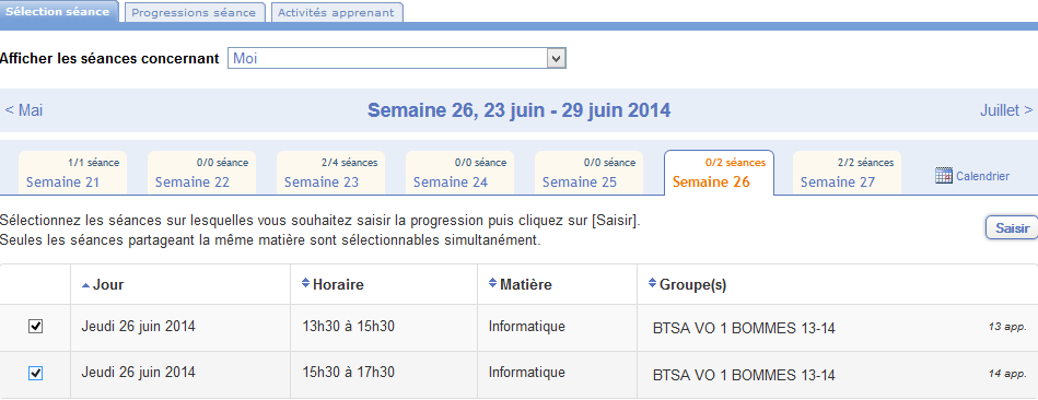 Cochez les séances sur lesquelles vous voulez saisir le travail que vous avez fait et cliquez sur Saisir ![]()