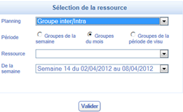 Lorsque vous avez effectué un choix dans cette liste, vous devez maintenant renseigner la période, la ressource c'est-à-dire le groupe concerné par votre recherche dans le menu déroulant ainsi que la semaine qui vous intéresse.