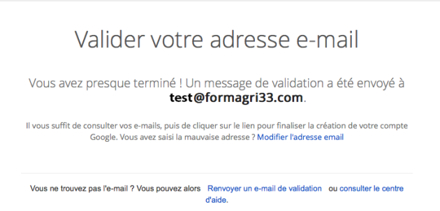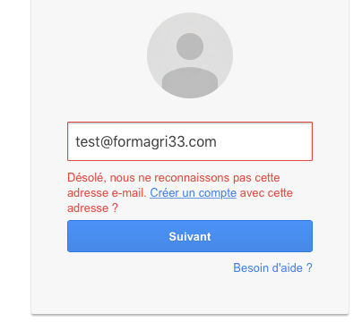 L'adresse entrée n'étant pas répertoriée comme faisant partie de l'organisation, vous avez la possibilité de créer un compte avec votre adresse en cliquant sur "Créer un compte"