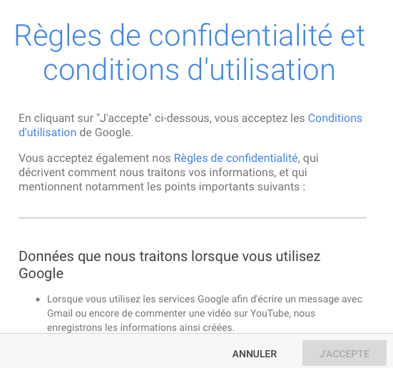 Validez puis acceptez les règles de confidentialité à l'aide de l’ascenseur, descendez pour que la cellule "J'accepte" soit cliquable.