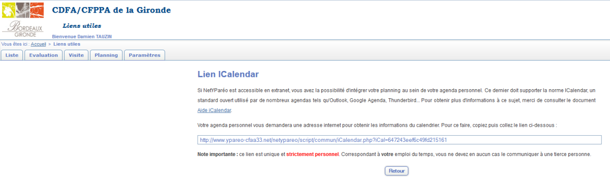 Vous avez la possibilité d'intégrer votre planning au sein de votre agenda personnel. Ce dernier doit supporter la norme ICalendar, un standard ouvert utilisé par de nombreux agendas tels qu'Outlook, Google Agenda, Thunderbird...