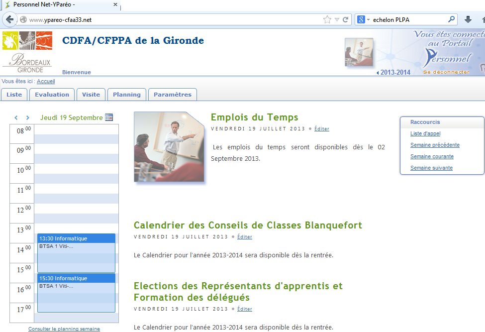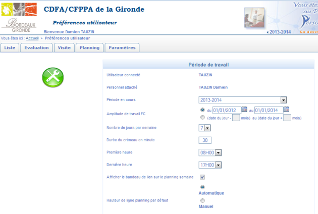 Vous pouvez modifier les paramètres d'affichage du planning en modifiant les champs de la page suivante, Période en cours, Amplitude de travail FC (Formation Continue), nombre de jours par semaine...