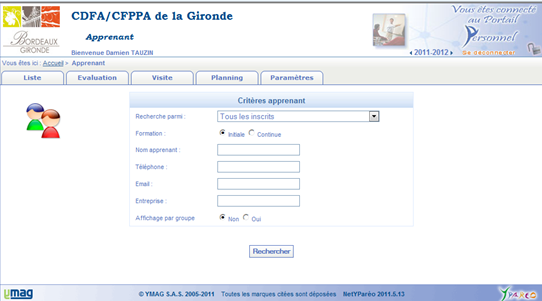 Ce menu vous permet de réaliser une recherche sur un apprenant ou un groupe d'apprenant en FI (Formation Initiale = Apprentissage ou DIMA), en FC (formation Continue) et avoir accès aux détails de sa fiche d'inscription et de son suivi pédagogique et professionnel.