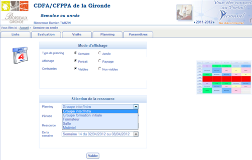 Lorsque vous avez effectué un choix dans cette liste, vous devez maintenant renseigner la période, la ressource c'est-à-dire le groupe concerné par votre recherche dans le menu déroulant ainsi que la semaine qui vous intéresse.